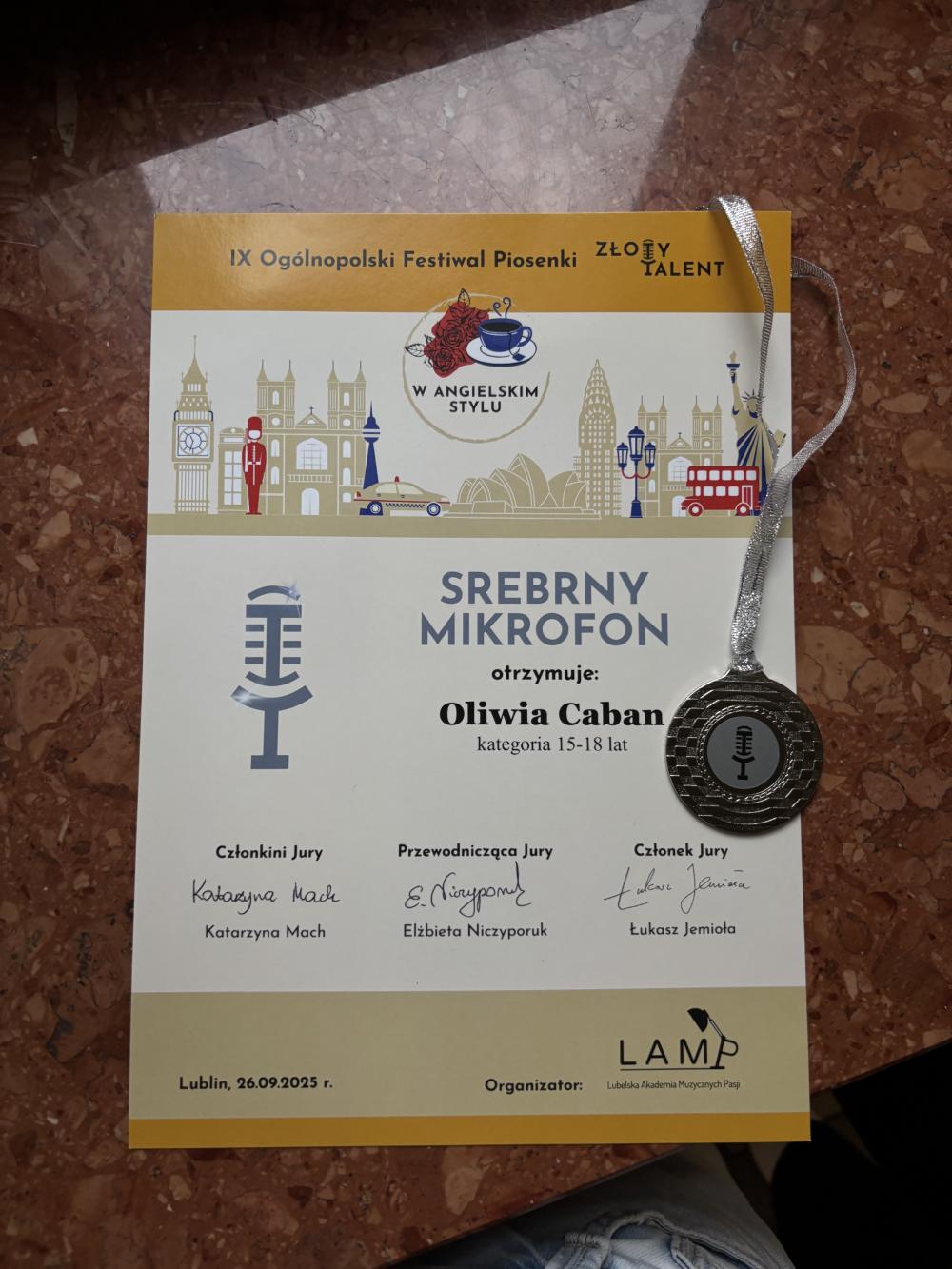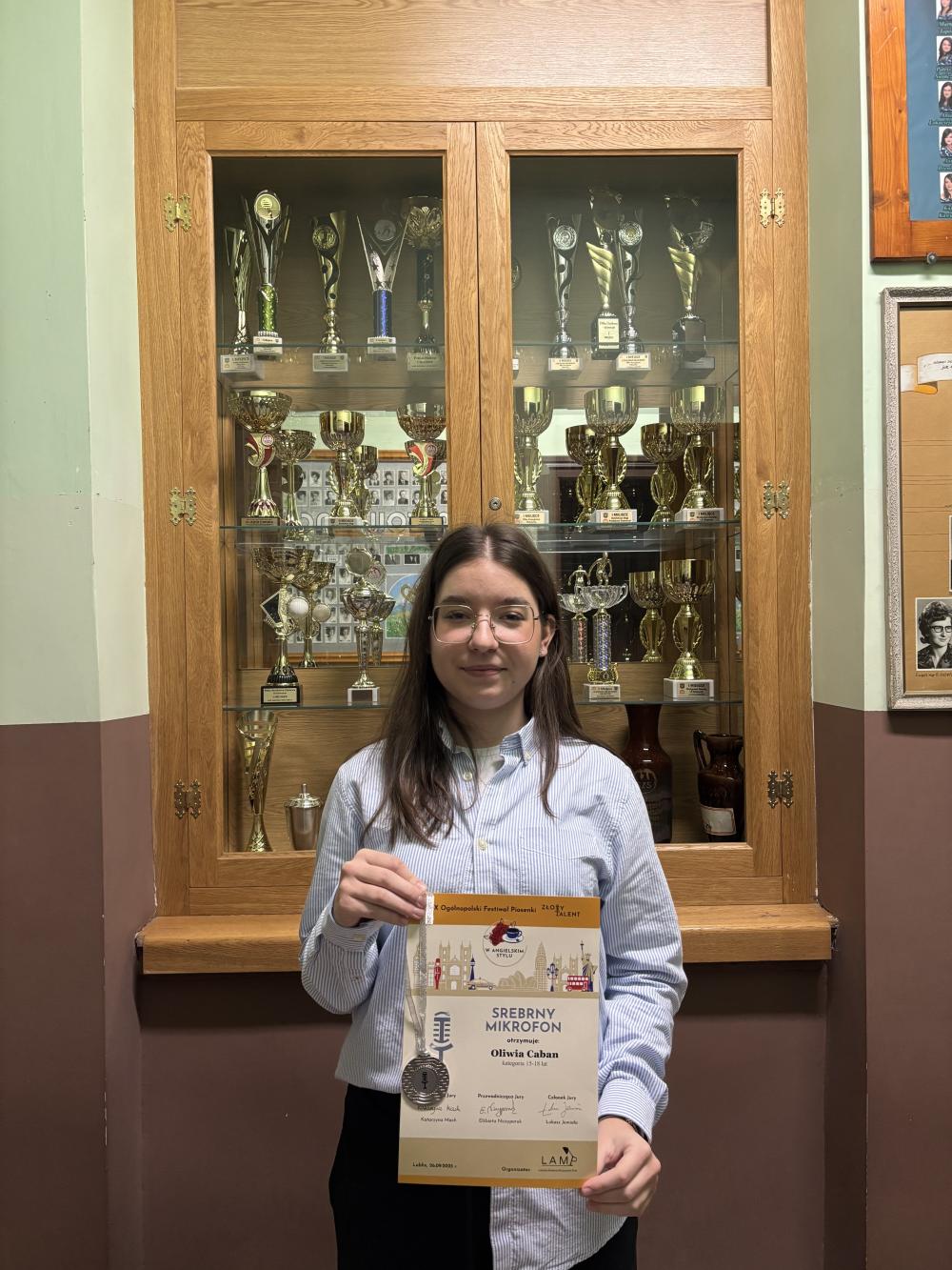 Już jakiś czas temu, bo 26 września 2025 r., z okazji Dnia Języków Obcych, odbył się IX Ogólnopolski Festiwal Piosenki „W angielskim stylu”. Trochę przyszło nam czekać na wyniki, ale już wiemy, że nasza uczennica Oliwia Caban z klasy 3a zajęła II miejsce! Gratulujemy!