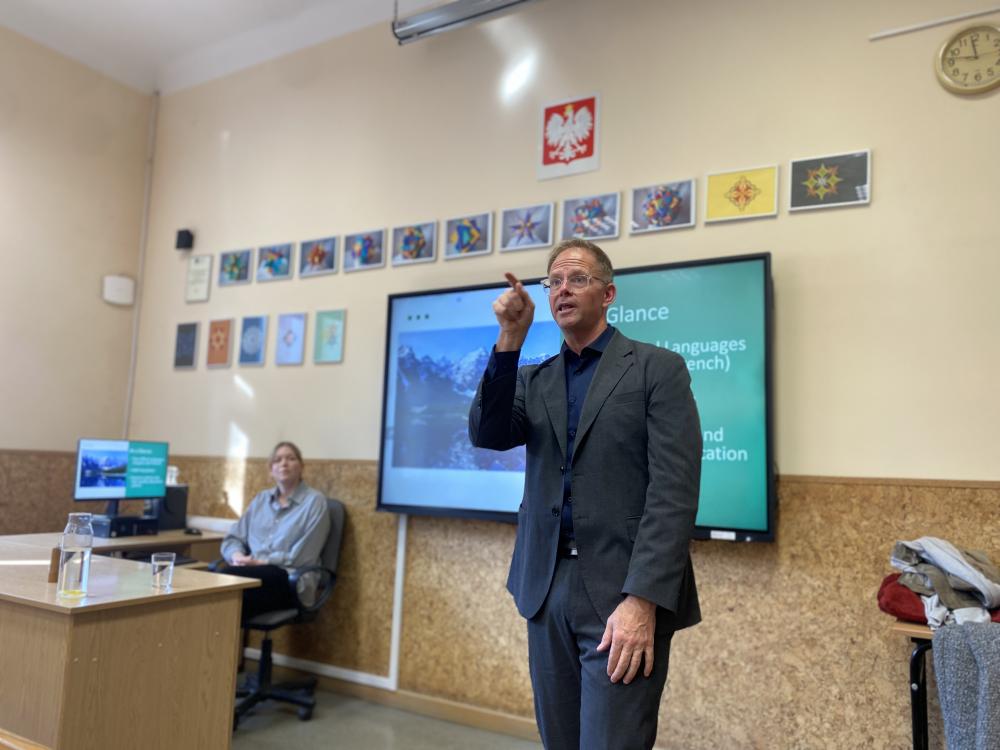 Dzięki współpracy z Project Travel w środę (5 listopada 2025) uczniowie naszego liceum mieli wyjątkową okazję spotkać się z Gregiem Kohanukiem, dyrektorem do spraw edukacji międzynarodowej w Comox Valley w Kanadzie. Podczas spotkania opowiadał on o kulturze swojego kraju, idei „melting pot” oraz niezwykłej kanadyjskiej przyrodzie.